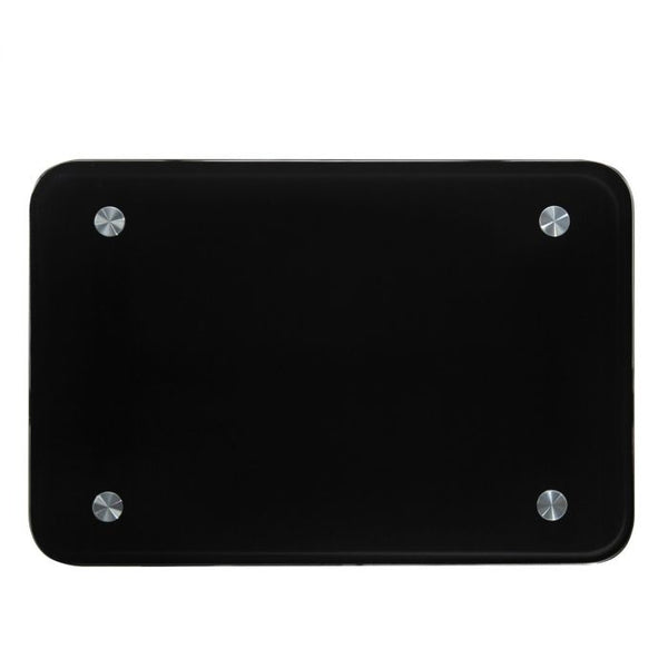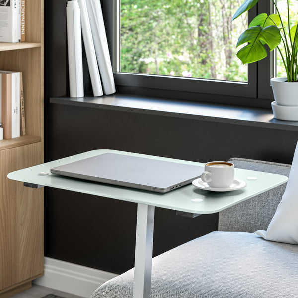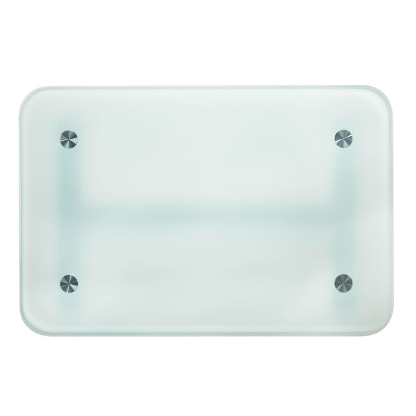 - Solid tempered glass table top measures 23.7" W x 15.8" D