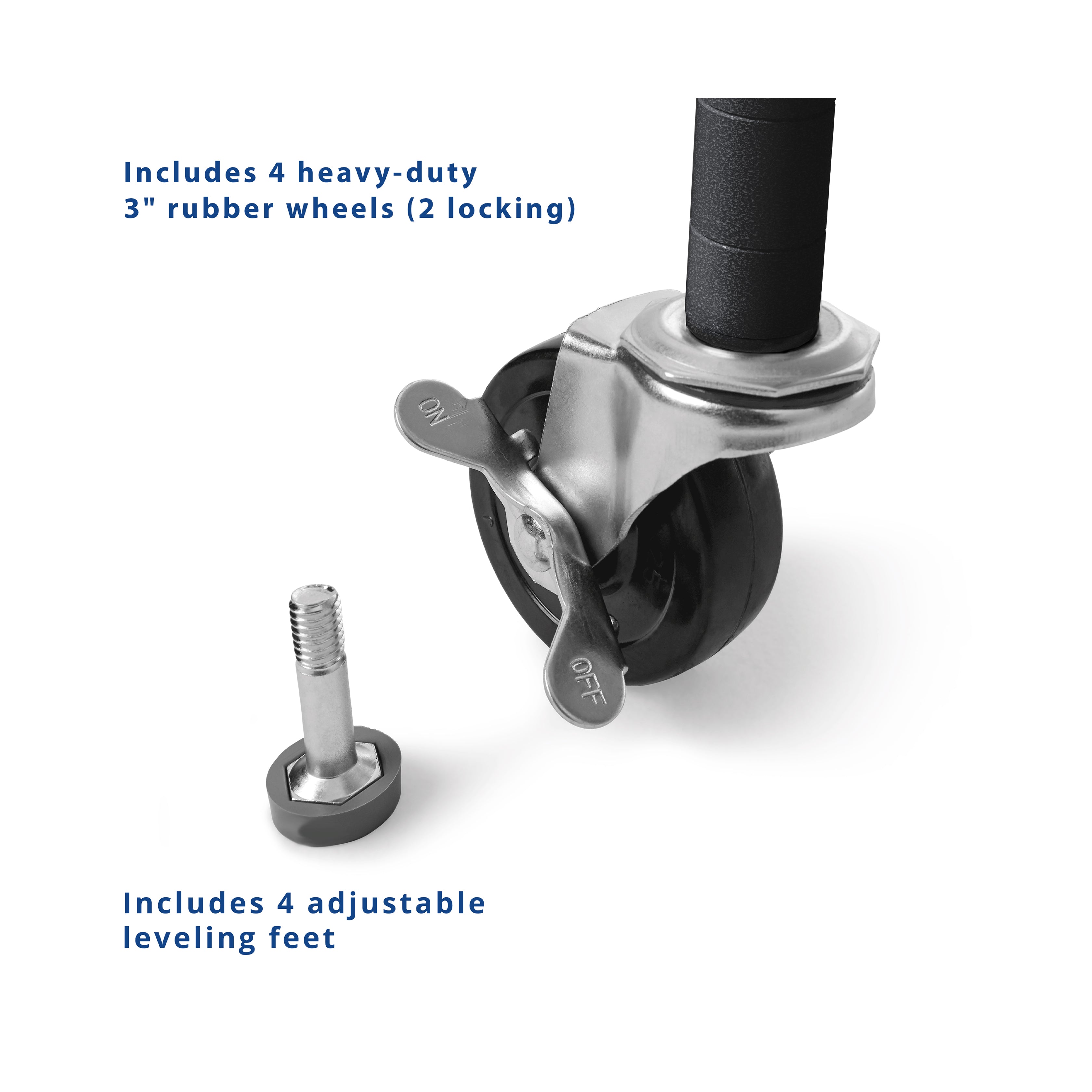 - 800 lb. total weight capacity for entire shelving unit on wheels