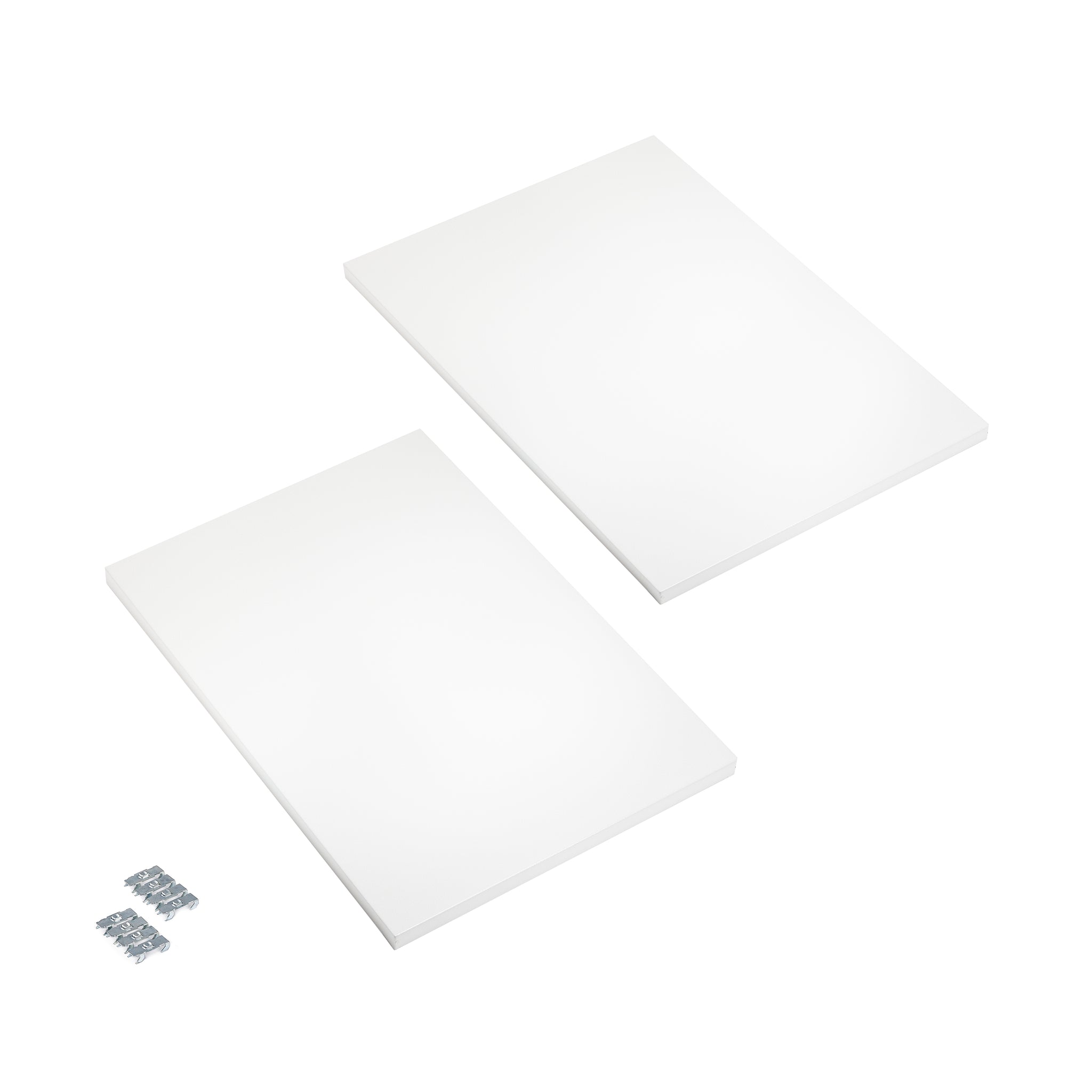 - Includes 2 shelves and 8 support mounting hooks
