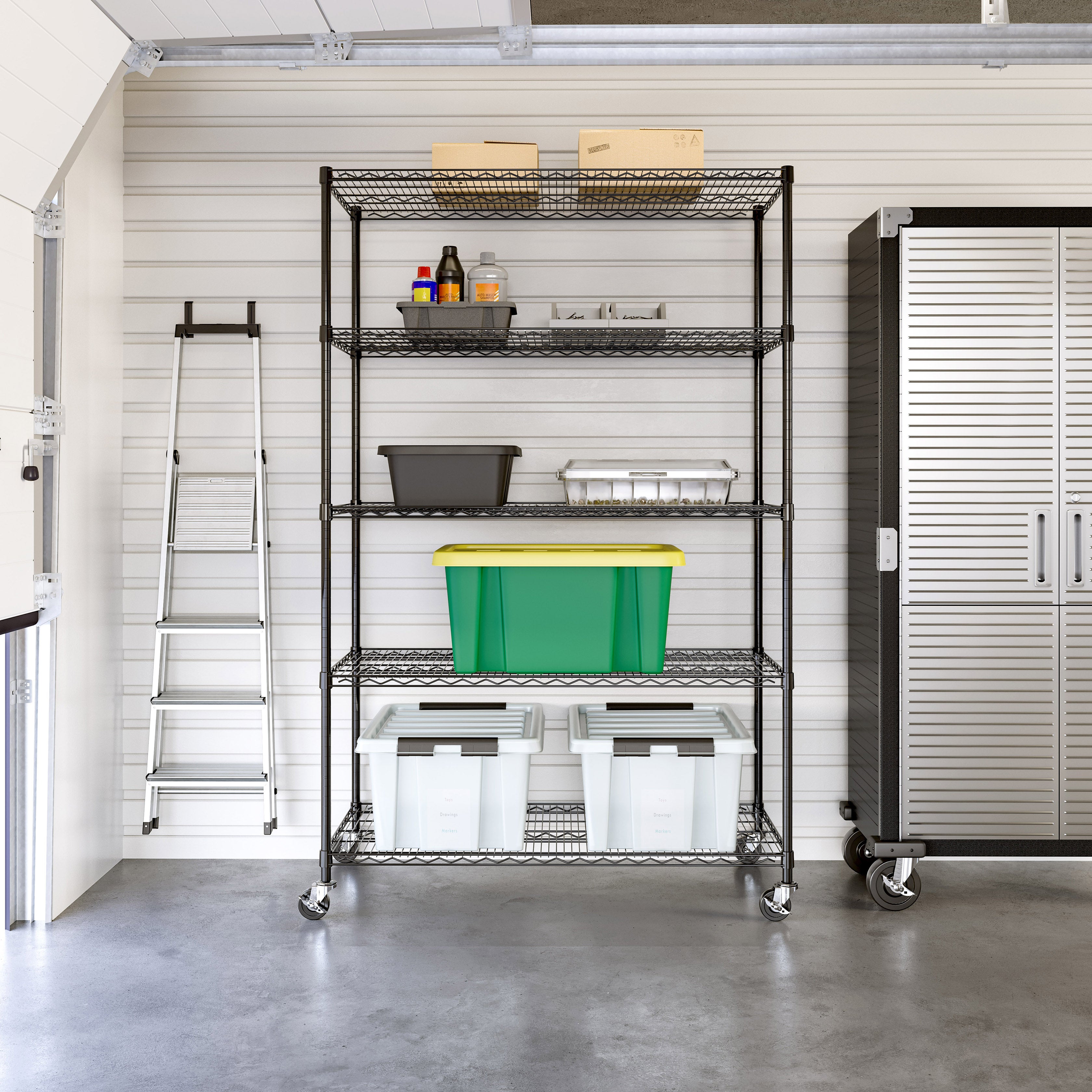- 5 heavy-duty steel wire shelves - height adjustable at 1" increments