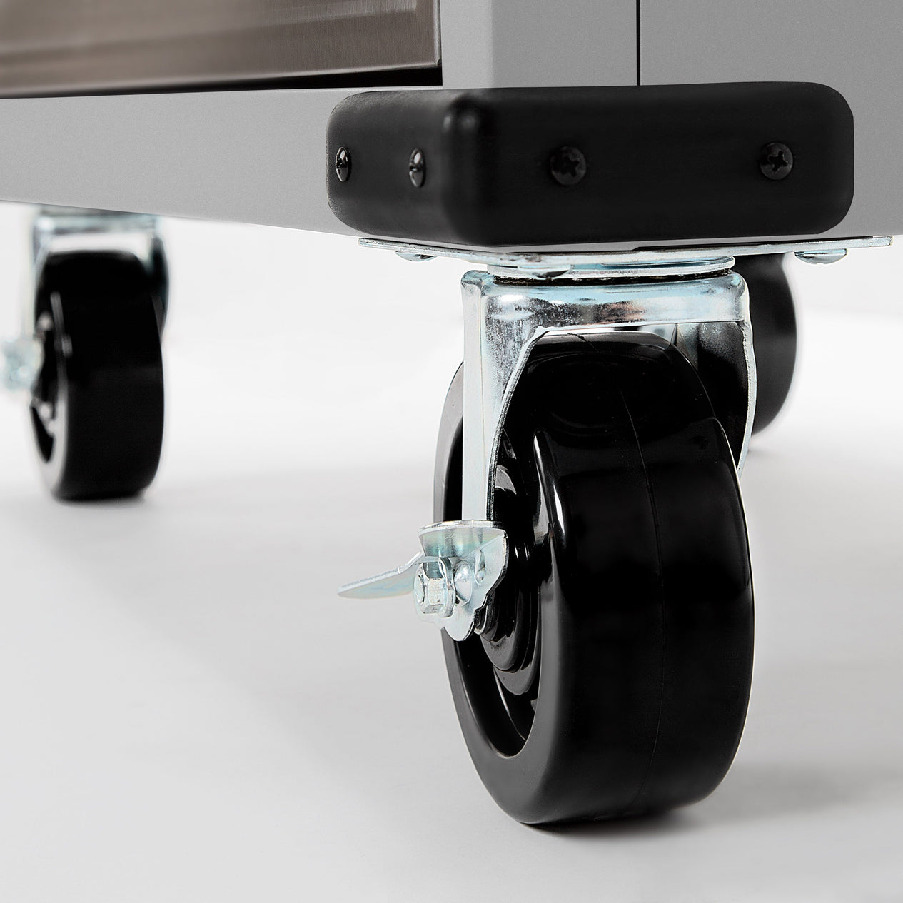 - All-steel construction with stainless steel front soft-closing drawers. Gently push the drawer about an inch to closure to trigger soft-closing.