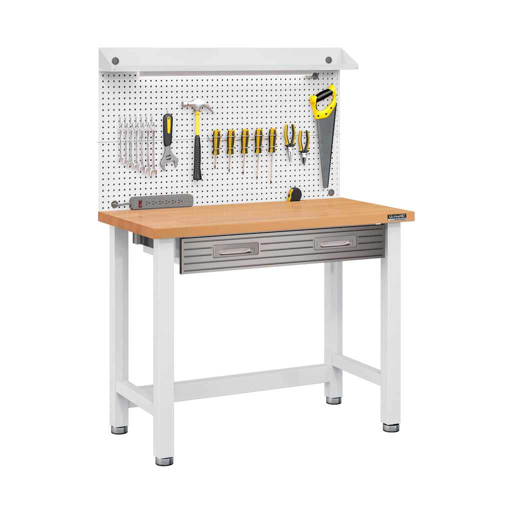• White legs and pegboard, stainless steel drawers, and wood table top, model no. UHD20291B